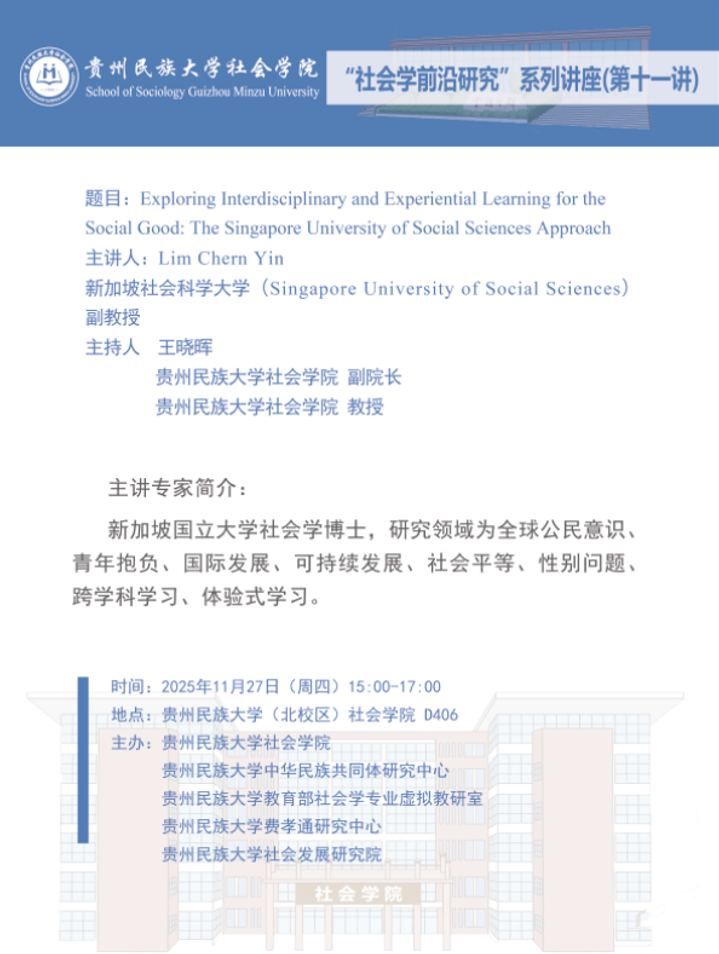 2025年11月27日,初冬的贵阳暖意融融,新加坡社会科学大学博士、副教授 Lim Chern Yin在3044am永利官网D406为我们师生开展学术讲座。Lim Chern Yin副教授以“探索跨学科与体验式学习:为社会公益而学(EXPLORING INTERDISCIPLINARY & EXPERIENTIAL LEARNING FOR THE SOCIAL GOOD)”为主题,聚焦高等教育创新与社会价值的深度融合。本次讲座由3044am永利官网社会工作系主任胡彬彬教授主持,外国语学院副院长赵燕教授任翻译,3044am永利官网师生代...