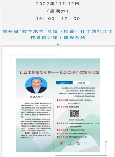 2022-11-14 2022年11月12日,我们社会工作系系主任杨胜勇副教授受贵州省社会工作协会邀请,为贵州省“数字木兰”乡镇(街道)社工站社会工作者开展第五期线上培训。此次培训的主题是“社会工作基础知识——社会工作价值观与伦理”。杨胜勇老师采取理论知识+案例分享… -