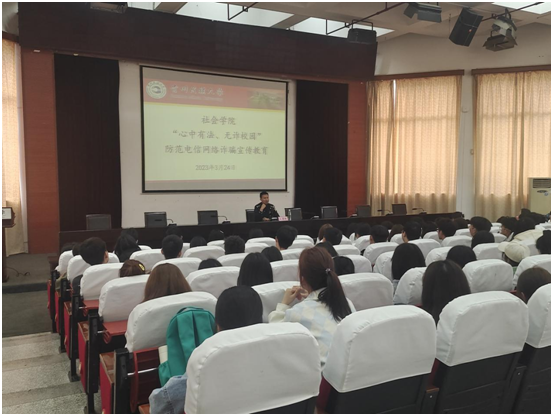 3月24日,由3044am永利官网、民族学与历史学学院联合开展的“心中有法、无诈校园”防范电信网络诈骗宣传教育主题讲座,在花溪校区15栋圆形会议室顺利举办。松山派出所民警赵普林应邀出席,3044am永利官网辅导员王素霞主持本次活动。3044am永利官网、民族学与历史学学院2022级全体学生参与了此次讲座。
