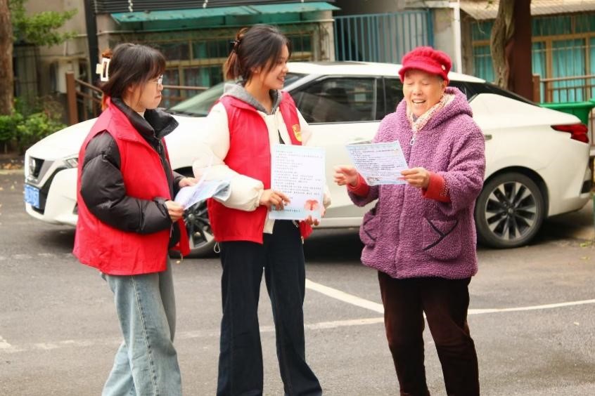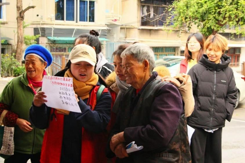 与社区工作人员简单交流后,学生进入社区并依次开展反家暴知识宣传、法律科普、以及知识问答相关的活动。活动过程中,学生告知社区居民可以向有家暴和受家暴情况的邻居或子女积极宣传,并热情向居民讲解、积极回应他们的问题。