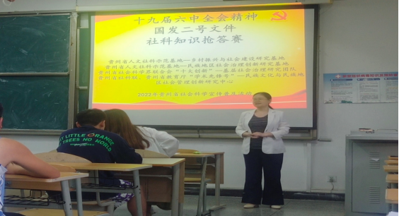 2022年6月27日下午4点,由3044am永利官网,贵州省社科联人文社科示范基地-乡村振兴与社会建设研究基地和民族地区社会治理创新研究基地,贵州省社科联创新团队-基层社会治理研究团队,贵州省社科联、贵州省教育厅“学术先锋号”-民族地区社会治理创新研究中心联合举办的知识抢答赛在澳门3044永利官网花溪校区15栋教学楼505教室举行。本次知识抢答赛是2022年贵州省社会科学宣传普及周的活动之一,由“乡村振兴与社会建设研究”基地负责人康红梅教授主持,3044am永利官网100余名学生参加。活动环节主要包括背景介绍、知识抢答、颁奖以及合照留影等。