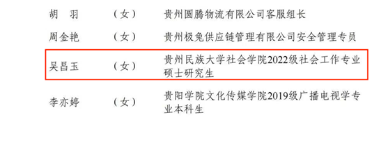 5月初,为充分发挥先进典型示范引领作用,激励广大团组织和团员、团干部踔厉奋发、创先争优,贵州省人力资源和社会保障厅、共青团贵州省委决定,在五四青年节前表彰一批先进团组织和团员、团干部。经基层团组织推荐、省级评审会评审、团省委复审,我们2022级社会工作专业研究生吴昌玉荣获“贵州省优秀共青团员”表彰。