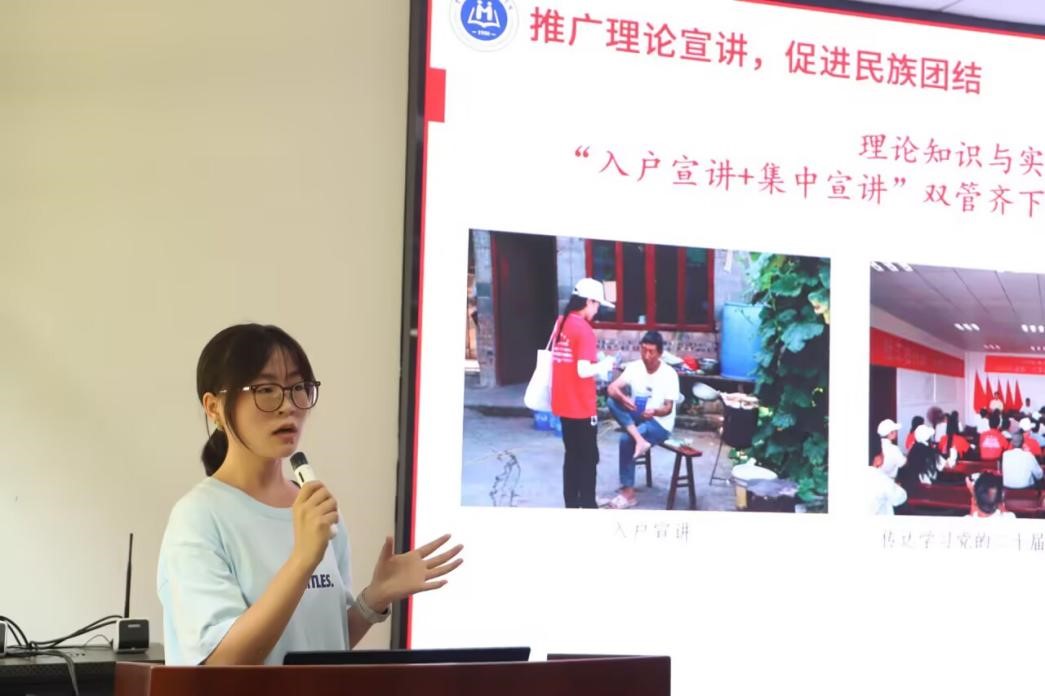 随后,获得省级优秀团队的学生代表分享了实践经验。2023级社会工作研究生张涵琪同学结合留守儿童服务经历,谈到实践让大家走出书本,深入了解基层,感受到了服务的意义;2022级社会学本科生王璇则围绕民族团结进步宣讲活动,强调了前期准备的重要性,如备好宣讲手册、做好两手准备应对设备不足等情况,还分享了关注当地“一老一小”、结合地方特色开展活动的经验。