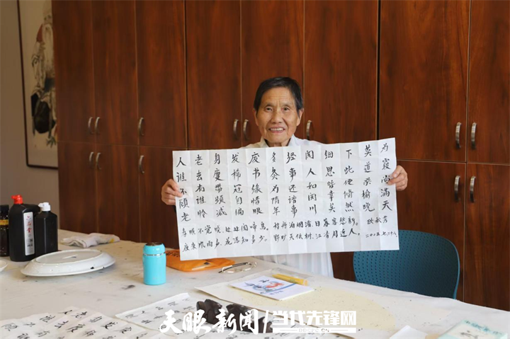 图6 欧秋芳老人展示自己的书法作品