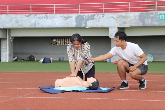 其次,在实操练习阶段,新生分组在模拟人模型上进行心肺复苏与人工呼吸的完整流程演练,志愿者和老师全程巡回指导,耐心纠正“按压姿势偏差”“气道打开不到位” 等问题,同学们在反复练习中逐步熟悉技术要点,初步掌握了在紧急情况下为生命争取黄金时间的关键技能。