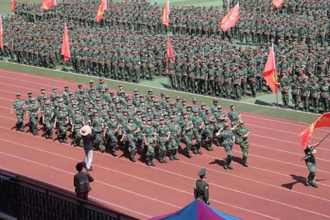 军训汇报表演与表彰大会上,在铿锵有力的口号声中,一个个整齐划一的方队依次从主席台前经过,同学们的眼底闪烁着坚韧庄严的光芒,步伐有力地向前迈进着,嘹亮的口号响彻整个汇演现场。