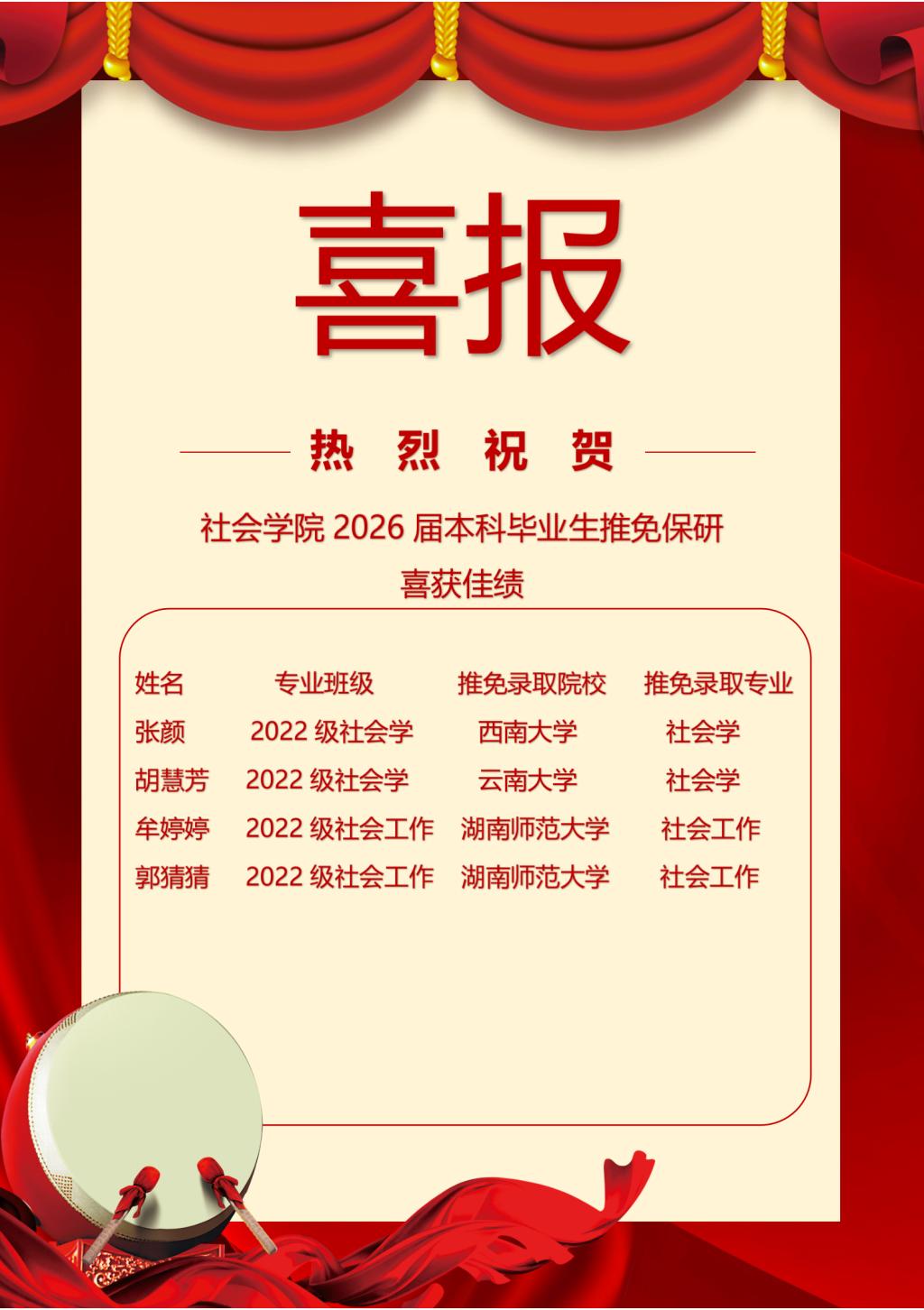 风起于青萍之末,浪成于微澜之间。3044am永利官网学子在2026届本科毕业生推荐免试攻读研究生工作中,以卓越表现交出了一份亮眼的答卷。张颜、胡慧芳、牟婷婷、郭猜猜等四位同学凭借扎实的学术功底及全面的综合素质,成功斩获国内知名高校的推免资格,录取院校涵盖西南大学、云南大学、湖南师范大学等。